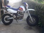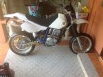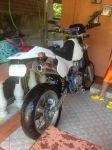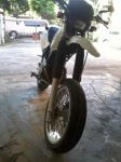 Supermoto is a class of racing. It typicly involves 80-90% ON road & 10-20% OFF road. they usually have a sorter course with tighter corners. in the offroad sections thier are jumps and burms and woops. the reason for the 17in rims are: #1 less centrifugal force resulting in quicker turnin. overall better" sportier "handling .#2 better tire options for street tires. steping down in front tire/rim size will result in less steering rake. which also plays in effect the nimble feel of the bike. but this is what i've been told and have read.