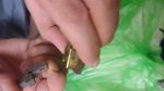 5: If you look down the space where the metal ring came from, you should see a brass "tang" (hopefully visible in the next shot...) This needs to be pushed in towards the centre of the lock barrel until it's flush, with something thin and strong, while simultaneously putting some pressure on the lugs on the end of the barrel. When it's flush enough, the barrel should pop out!