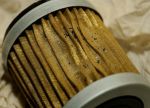 Here's a pic of my last oil filter. It has bits in it, which I suppose means it did the job but I'll admit to being a bit horrified. Most are black but a few are metallic. I can't draw them out with a magnet so I guess they're either squeezed in really tight or non ferric.
