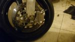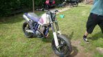 Nothing is standard on front end mate it's 97 yz250 usd forks straight bolt on same bearings and steering lock, just steering tube is longer so needs a cone making up for yokes as sits higer but all the better for it as raises bars to right height, the wheel is off a fzr600 milled down on disc side to fit as tight clearances and caliper is off a aprillia svx450 race supermoto with a one off caliper bracket to fit as there a radial mount caliper.