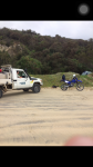 Ranger inspecting beach permit. Blossom was my pillion untill we nearly fell off here. Boggy sand with a pillion is impossible on slow turns. I was in the car track going good for a while. Wasnt allowed on sandy tracks anymore with blossom on the back.