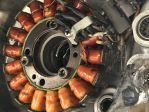 Difficult to say but either the stator wires weren't installed properly hence they rubbed on the flywheel or something fell in and stuck to the flywheel. Is there any evidence of a foreign body anywhere on the flywheel or around the stator?