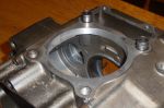 If you look closely you can see the machining of the crank case side. This is the biggest sleeve that will fit in these cases. If you want to go bigger than 350 boys, one of you is going to have to develop a stroker. It ain't me babe. (At least not this year!!!)