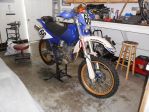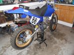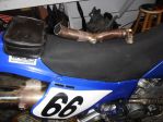 You can see the old Yamaha titanium muffler and original fork set in the photo. I wrapped the street bike muffler with a blue anodized aluminum foil sticker material and added FMF Ti 4.1 stickers to it to help fool any onlookers!