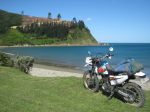 Took a loop around Port Underwood and Picton today, trying out the same luggage I used on the Serow 7 years ago - an old canvas (with aluminium frame) NZ made tramping pack. Works perfectly, attaches with metal hooks from tie-downs that slide over the grab-handles, and 2 15cm long pieces of thick bungee cord. Takes a minute to take on/off. Has enough movement to allow the whole pack to give some extra room when shifting backwards on steep descents, and it always stays well secured. Light, cheap and can still swing my leg over it.