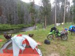 Day three was welcome light rainl and overcast ride through barren grassy hills, saw moose and deer as per normal and into Dillion Mt by noon, then on to Ghost town, WE HAD TO ABORT A 25 mile ride on dirt due to washed out roads, Bannock Ghostown and onto camping on BLOODY DICK CREEK just below the resevoir. Bear in camp at nite, but our food was hoisted up in a tree, camper down the road fired warning shot over bears head and brought us to attention at 5:30 am.