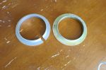 Scored a 5.5kg/mm(54 N/mm) Ohlins spring for pretty cheap. The application is for newer KTM & Husqvarna models. Stock spring is 60x61x247, the Ohlins is 61x61x250 so very close dimensions. I got a 58 to 61 collar/adapter to take out the slop at the bottom seat. Out of curiosity I first installed it on the shock w/the stock part, it wiggled a bit but was solid as soon as there was any spring pressure. Probably could have gotten away without the adapter piece but it was only $7.