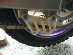 I have just mounted my "street" rear wheel, with a 100/90-18 street tyre which I had lying around and a new 43 tooth sprocket to ride in town or longer distances. In front I have a 14 tooth sprocket. For more serious off road riding I have a second rear wheel with a proper off road tyre and a 50 tooth sprocket. I can easily swap the wheel and the chain from one setup to the other.